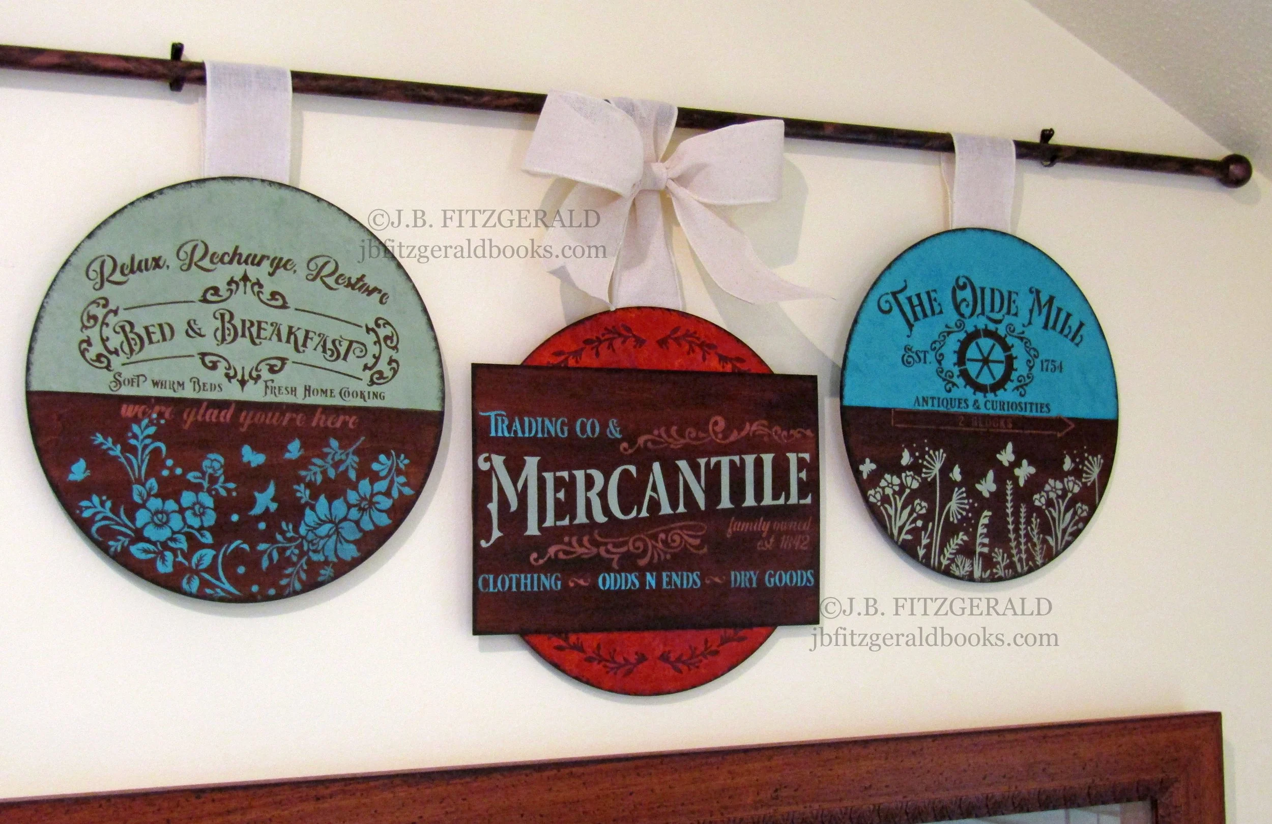 If a dowel supporting three dangling artworks can cover those eyesores at Christmastime, then why can't a different dowel supporting three other artworks reside there the rest of the year? I opted for a coordinated set of signs, a display of distressed vintage-inspired whimsy. And, while we had to put up with the clutter of craft supplies and several drying pieces spread over multiple surfaces for a while (not to mention numerous containers of custom-mixed paint colors in the refrigerator), now that the collection is done, I won't have to gaze upon those unsightly hangers again until this trio vacates their home in November to make room for Christmas...that is, assuming ill-treated, long-dead miners harbor no enduring grievances against my handmade signage.