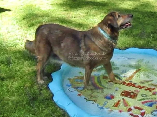 As the thermometer dipped its toes back into the nineties, we splayed that splash pad over the lawn and filled it with water. Dennie kicked off her shoes and stepped onto the colorfully illustrated mat with the overly optimistic goal of encouraging Maisie to do the same. Judging from the initial yelp (from Dennie, not the pup), I gathered the water was like Ice Ice, Baby. In our most excited tones, we called to Maisie. Dennie kicked at the shallows. We laughed. We got super silly. We painted a living picture of summertime bliss that was not to be missed. In doing so, we'd recast ourselves as the ultimate Spin Doctors, promising big, big fun, refreshment, even the rejuvenating properties of the Fountain of Youth, albeit a less opulent fountain constructed of BPA-free PVC. Nothing worked. We moved on to Plan B--porcine peer pressure.