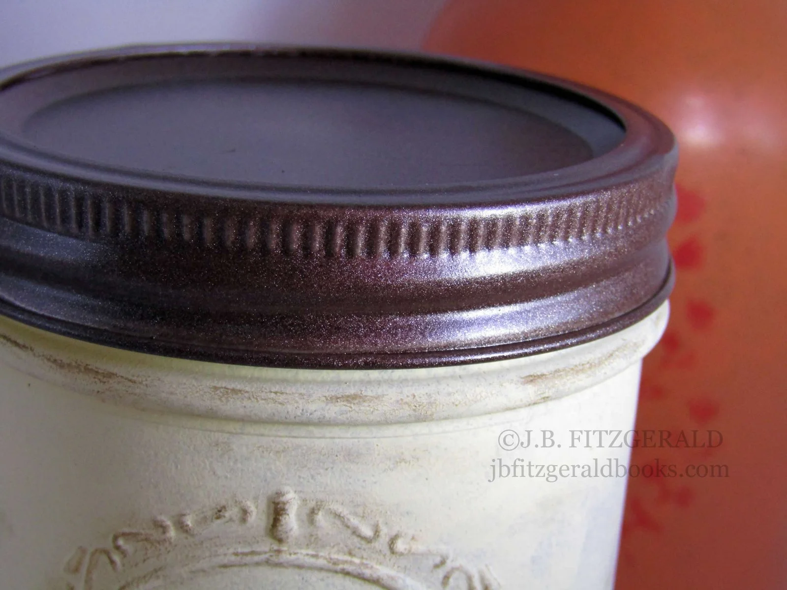 Adding hints of distressing for a vintage look, as shown on the canning jar, is surprisingly easy and kind of liberating as it requires little skill or attention to detail. Dip a flat-headed brush into paint color of your choice. Blot repeatedly on dry towel until only faint traces of paint appear on the towel. This is a dry-brush technique and only the lightest whisper of color is needed on your brush. Lightly swipe brush over areas where you want the distressing to appear. This can be done on smooth surfaces too, but it looks especially nice on embossed jars. Don't worry about an even application. Natural aging doesn't look perfect, so be as imperfect as you can be, sticking to exposed areas most likely to be affected by age and elements. It's more fun to just let your brush swipe freely, and the end result will look more authentic too.