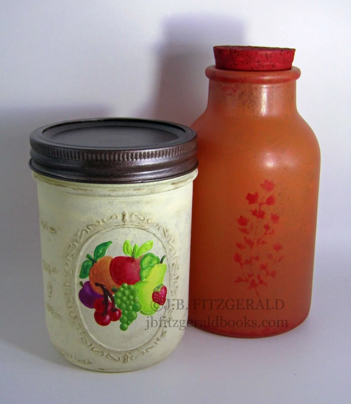 While we have nowhere near enough room to store every glass receptacle that delivers thirst-quenching liquids or flavor-enhancing condiments to our table, jars and bottles with creative potential--those with a little extra character--are the ones that avoid the bumpy, clinking journey to the recycling center. In addition to repurposing spice jars on multiple occasions, in 2015, two honey mustard bottles and three Starbucks Frappucino bottles became colorful, paint-spattered objets d'art visible through the glass doors of a kitchen cabinet. Three years later, I turned an ordinary canning jar into a vintage lotion pump. In 2024, another clear bottle, another clear jar were destined to fulfill their designated kitchen storage purposes with a brand new look, while simultaneously providing this online tutorial for any of you who might also wish to elevate ordinary glass to extraordinary new levels. It's not difficult to do. It takes only minimal supplies and a bit of patience.