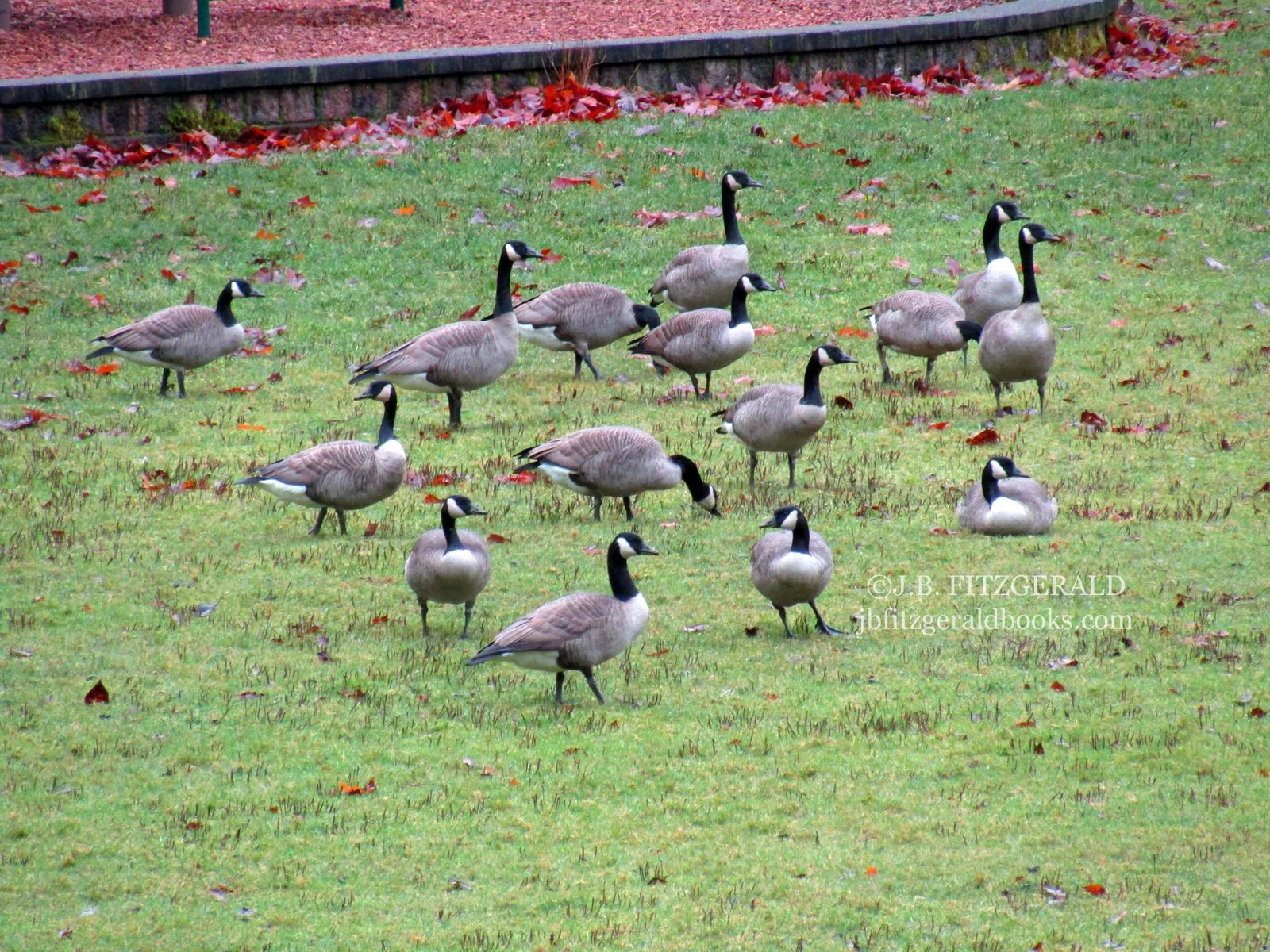 Two large migrating flocks had scattered over the playground lawn. There must have been thirty or forty of them, at least. As we ambled along the shore, one male stood up tall, flapped his wings and honked repeatedly, signaling his flock to take flight. They soared right past us, low over the water to the far end of the lake before skimming the glassy surface and landing in almost perfect unison. A few minutes later, another male in the other flock exhibited the same behaviors. The remaining geese took off in familiar fashion, joining their traveling companions for a swim in the distance.